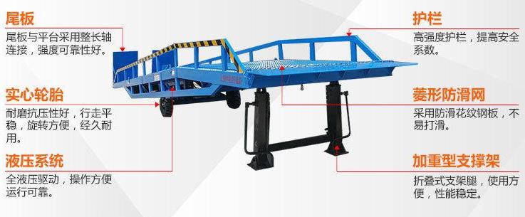 棗莊登車橋-集裝箱裝卸過橋-裝車斜坡登高裝貨叉車液壓登車橋-移動式液壓登車橋應用于無裝卸設備的貨臺及流動裝卸場所,是與叉車配合使用的貨物裝卸輔助設備。借助該設備,叉車能直接駛入汽車車廂內部進行批量裝卸作業。只需單人操作,不需要動力電源,即可實物的安全快速裝卸。即可使您減輕勞動強度,又能成倍提高裝卸作業效率,加快物料流通速度,獲取更大經濟效.臺面使用特制的菱形網絡板有可靠的強度,能保證長期使用而。它的菱形網狀結構,充分保證了防滑性能,使叉車有更好的爬坡性和可操作性。即使在雨、雪罐子。仍能保證正常使用。